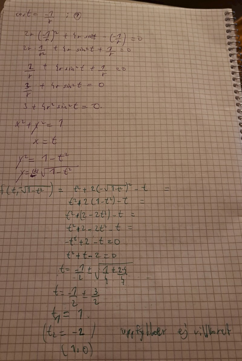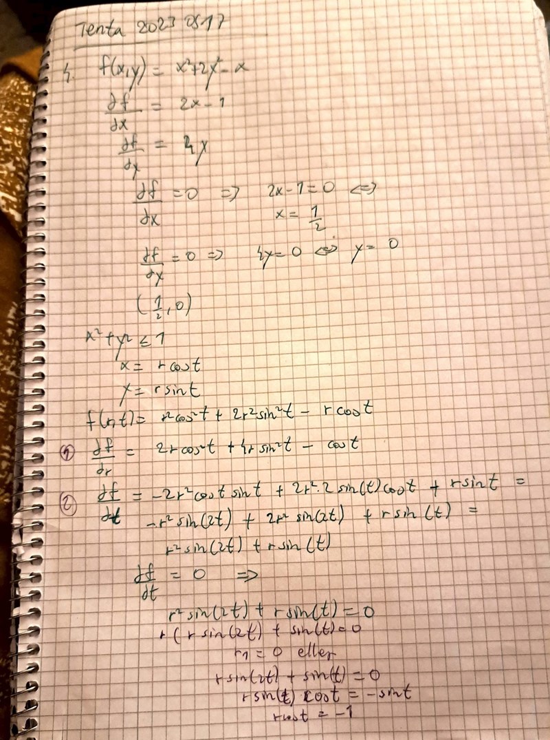 Stationära punkter inuti skivan. Hur undersöker jag områdets rand? Jag försökte parametrisera med x=rcost och y=rsint men den metoden funkar ej alls för att lösa uppgiften. Jag får en jobbig uttryck enligt bilden ovan. Ska jag sätta r=1?