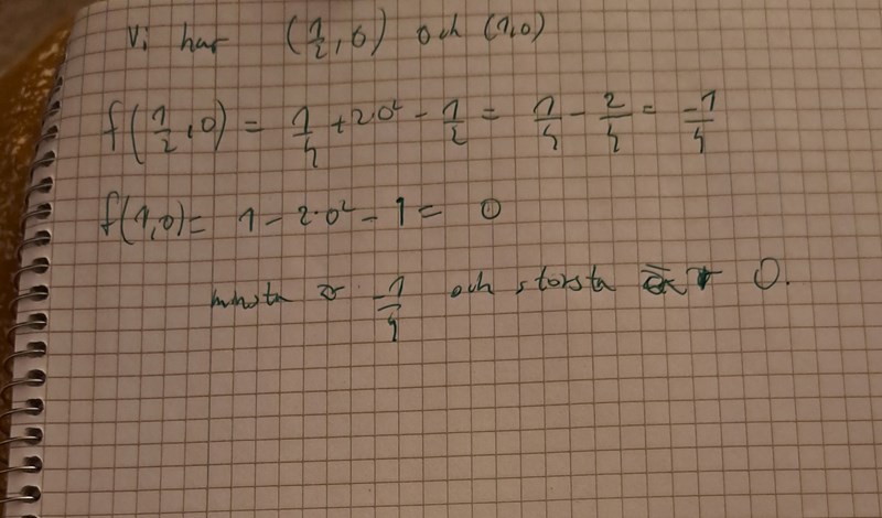 Trinity2 skrev:destiny99 skrev:Trinity2 skrev:Det området har ingen rand. Det har bara "ett inre" som du undersöker med stationära punkter.