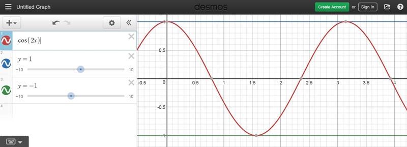 Värdet på funktionen cos(2x) [röd kurva] varierar mellan -1 [grön linje] och +1 [blå linje] (se figuren).