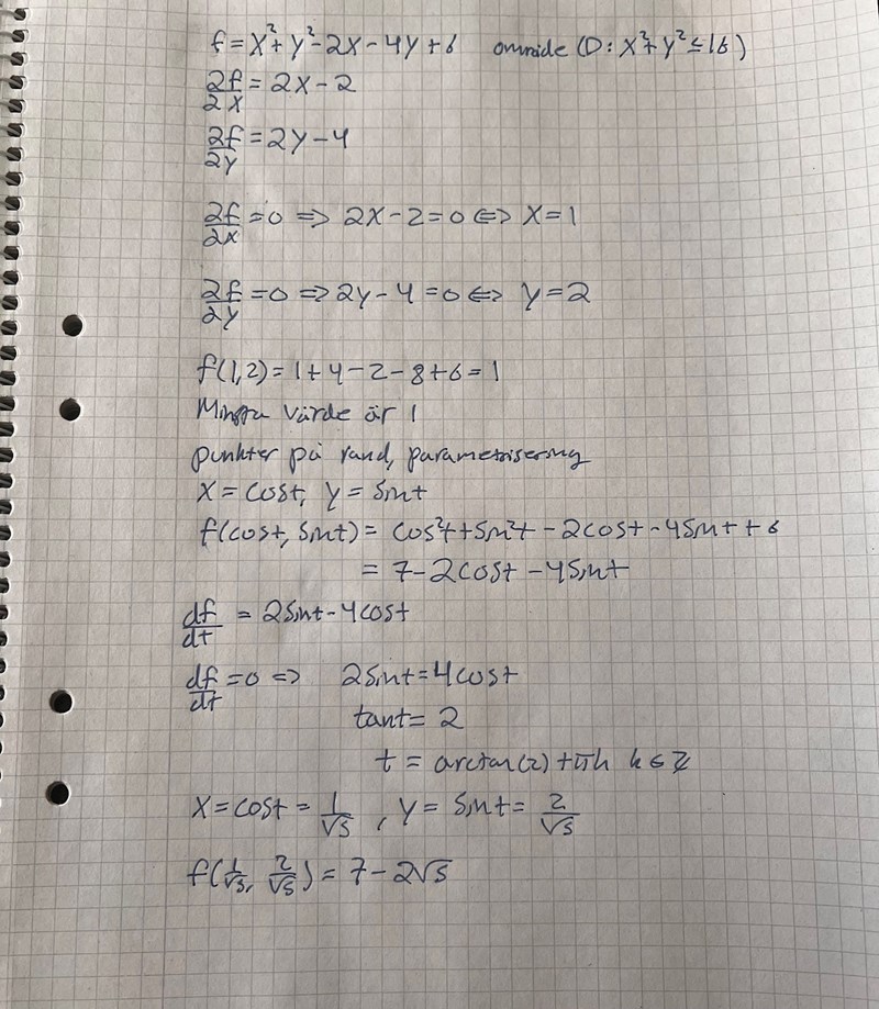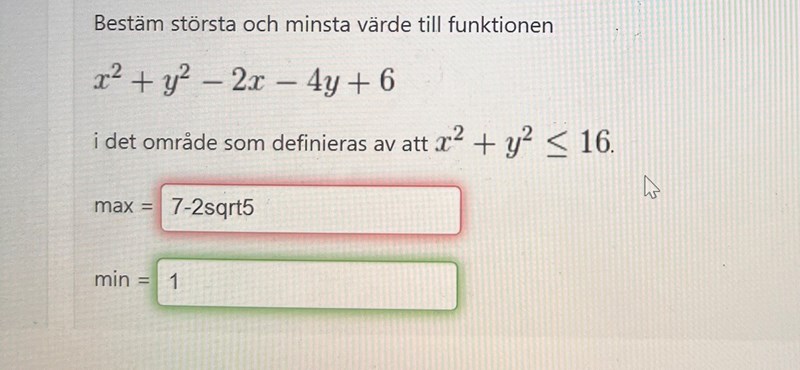 Får 22-40/sqrt5 om jag använder x=4cost, y= 4sint, fortfarande fel svar tydligen