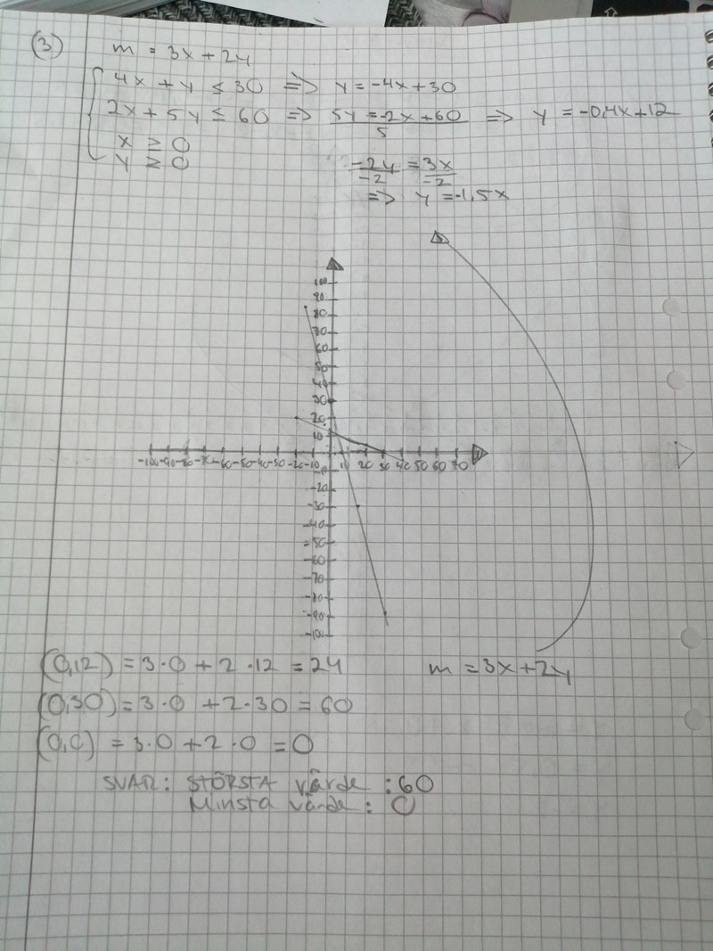 Man ska bestämma största och minsta värde på funktionen m=3x+2y