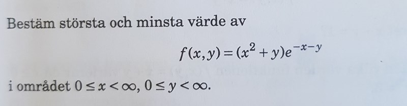 Louiger skrev:Tyvärr är jag intr klokare på uppgiften. Svaret är störst 4e^(-2), minst 0.