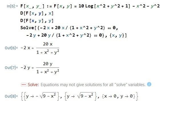 Tänker att detta innebär att det största värdet som fås innanför randen är då x=0, y = 0 men det är ej korrekt. För att räkna ut punkterna på randen satte jag x=4cost och y = 4sint i funktionen F[x,y]. Deriverar sedan funktionen m.a.p t och sätter derivatan lika med 0. Detta ger t=Pi och t=Pi/2 vilket ger x=-4, y= 0 och x=0, y = 4. Båda dessa ger F[-4,0]=F[0,4]= (-16+10ln(17)). Antog att detta värde är funktionens störste värde på randen men får ej korrekt där heller. Uträkningarna gör jag mha Mathematica då det är så vi ska lösa uppgiften, därav skriver jag lite längre istället för att bara skicka en uträkning.