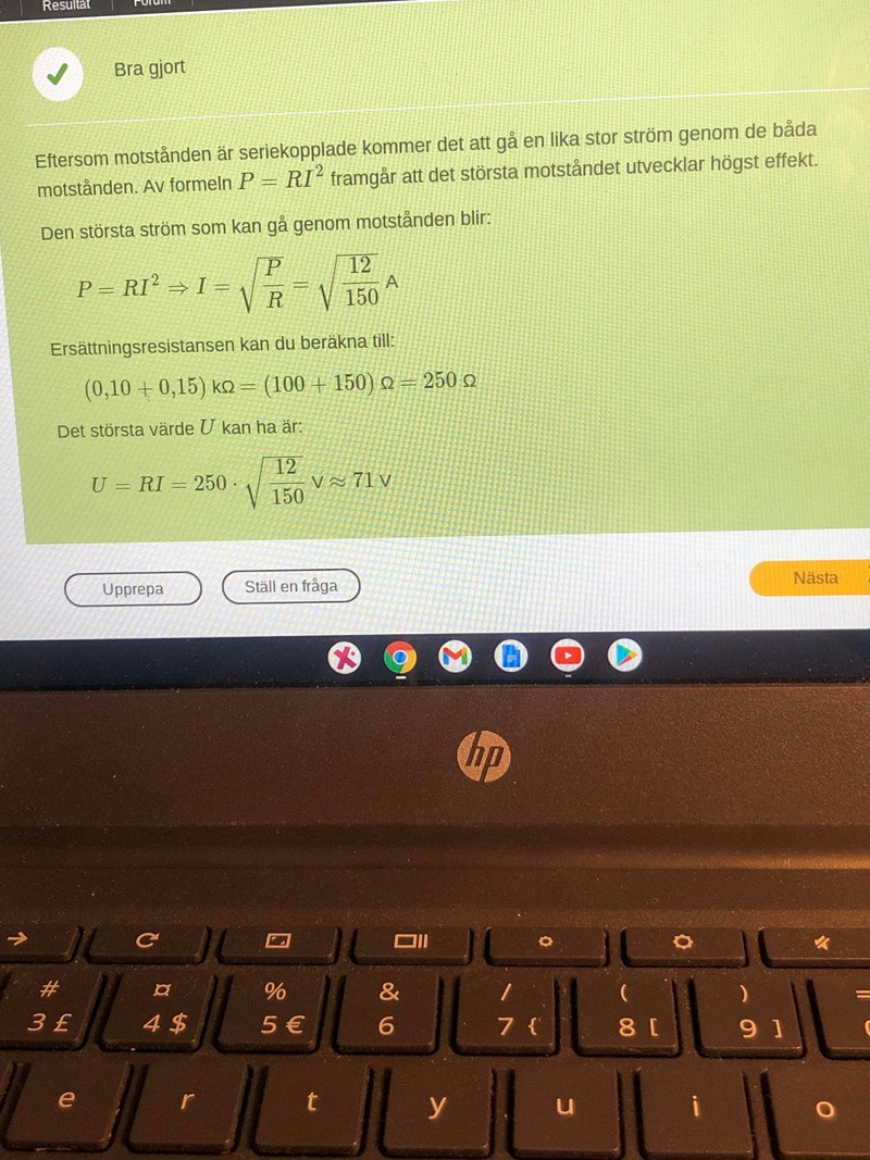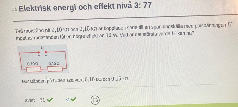 Eftersom motstånden är kopplade i serie så går det samma ström genom dem. Då utvecklar det största motståndet mest effekt och denna får maximalt vara 12 W. Det är alltså 150 Ω motståndet som bestämmer strömmen.