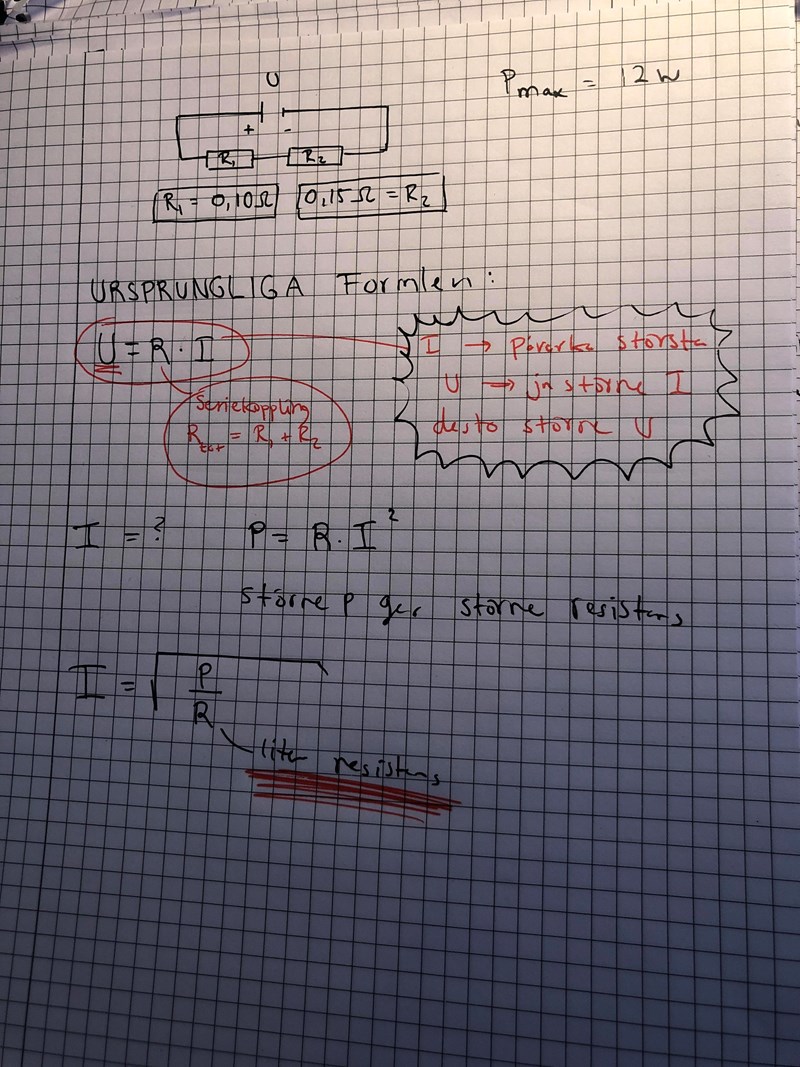 Jag tänkte använda ohms lag för att få U men för det krävs det att jag tar reda på vad det största värdet på I (strömmen) blir. Jag kommer fram till att jag måste utgå ifrån att R måste vara det minsta som fanns i uppgiften (0.1)om vi vill ha sån stor ström som möjligt. Där jag har strukigt under med röd pennan.