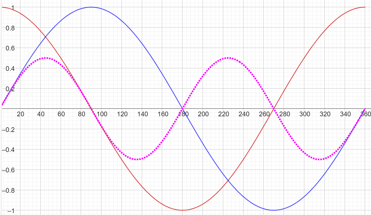 Bjuder på hur sin(x) i rött, samt cos(x) i blått ser ut i intervallet 0-360 grader. Det har du sett en massa gånger. Kika även på den lila kurvan som är produkten.