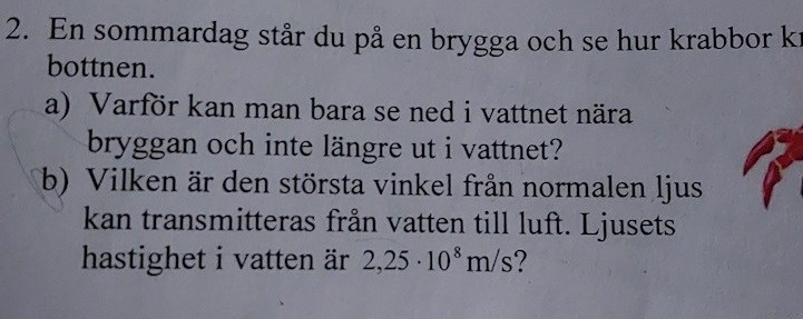Angående bilden: För att du skall se krabban skall reflekterat ljus från krabban brytas i vattenytan och nå ditt öga. Utgå ifrån krabban och rita en ljusstråle därifrån. Du ser inte krabbor vars reflekterade ljus inte når ditt öga, utan totalreflekteras (underifån) i vattenytan.
