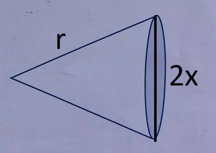 Ser inte riktigt vad du skrivit i fig, men det är cirkelsektorns radie (i texten angiven som r) som du får betrakta som en given konstant. Ditt r2 är väl bottenytans radie och den beror på r och på den variabla medelpunktvinkeln.