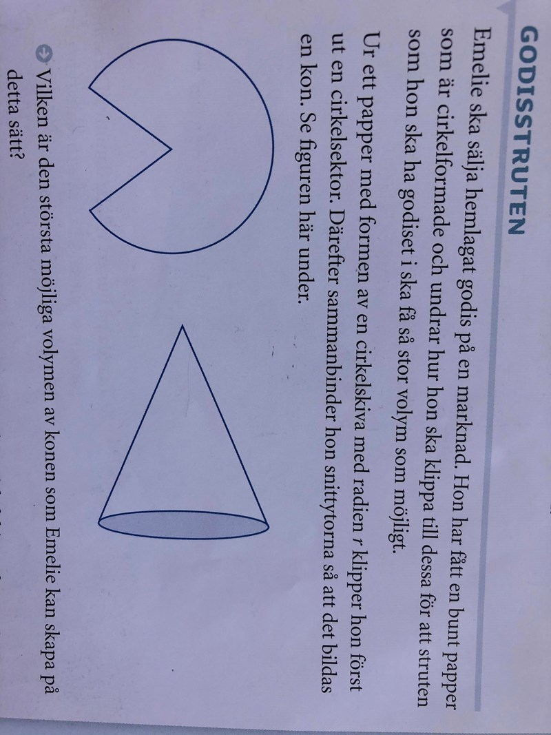 Du borde kunna tänka så här. Vilken är den största volymen av en kon med dimensioner enligt nedan: