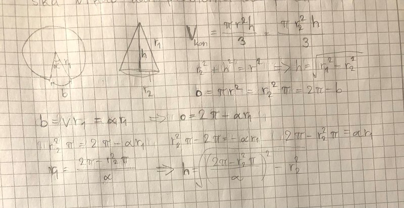 (R är radien på cirkeln, alltså konens sida vilken är konstant, r är konens radie och h är konens höjd)