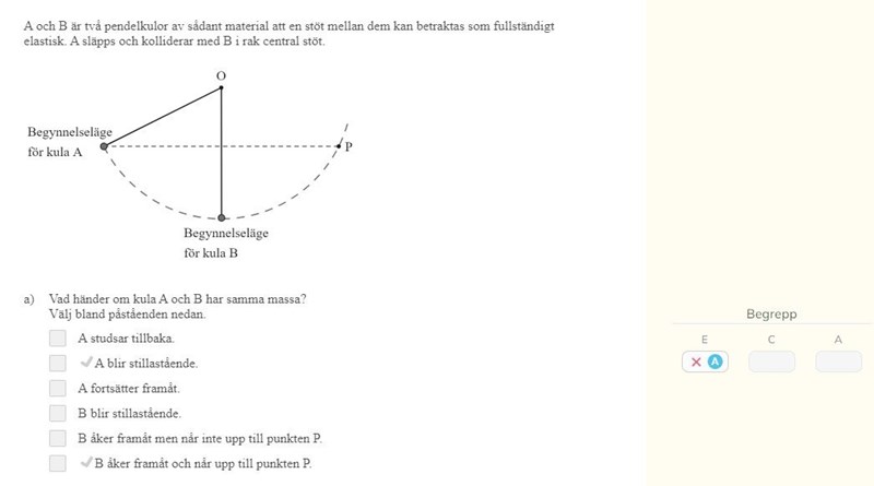 Åt vilket håll är rörelsemängden riktad precis innan stöten? Hur stor är rörelsemängden om vi antar att kulorna väger kg var och att A har hastigheten från början.