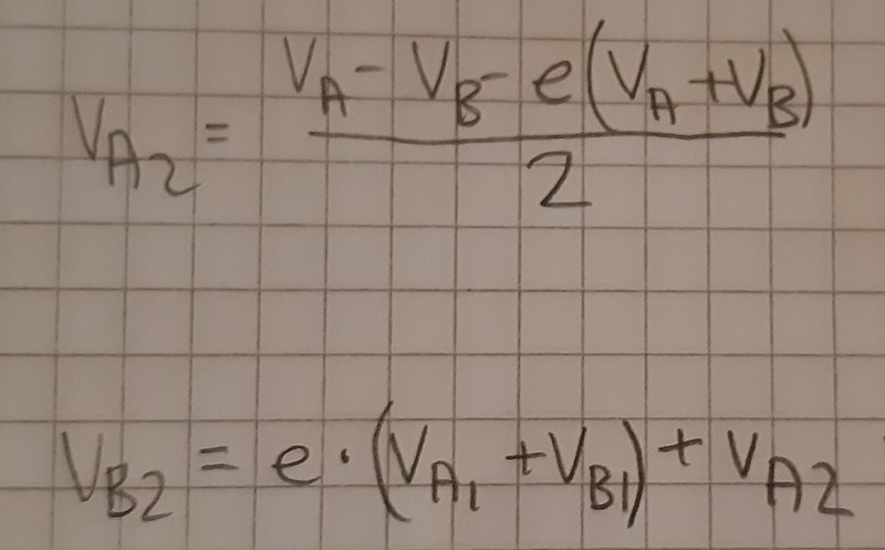e= u1-u0/(v1-v0) -> e *v1-v0= u1-u0 . (du har skrivit e. vB(t2) - vA(t2) = -e(vB(t1) - vA(t1) hur kan de va e två gånger.