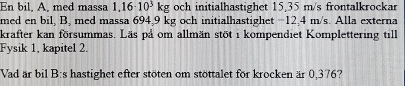 lös ut v. skit i stöttalet du behöver inte veta det även VB2och VA2. (skriv inte egna beteckningar använd u1 och u2 så står för efter kollision snälla.)  Och din lärare/bok suger då de egentligen måste ange vad för typ av stöt det är.