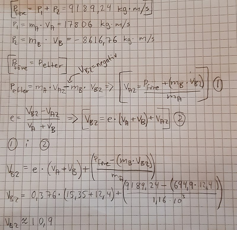 du använder fel formel. Använder du denna formel går det inte då du har två okända variabler (VB2 OCH VA2). hastigheten efter kollisionen kommer vara en.