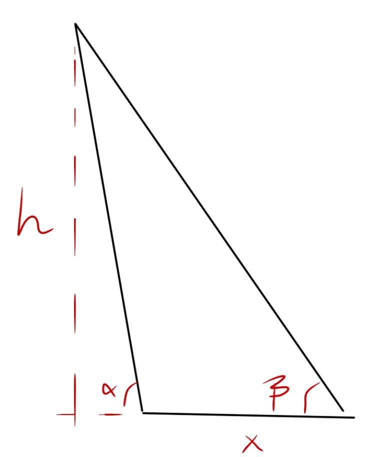 Där vinklarna och alltså är de som jag ritat i min figur. De är okända men vi kanske kan lösa det på något vis senare.