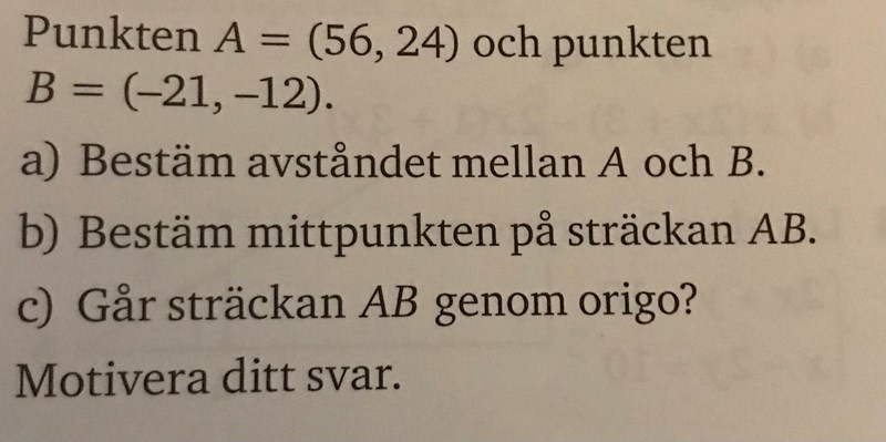 Jag löste a och fick fram svaret 85 genom att följa avståndsformeln och jag är säker på mitt svar men skulle ändå vilja få en bekräftelse om det är rätt eller inte. Jag har ingen aning om hur jag ska bestäma mittpunkten på sträckan AB och hur jag vet att sträckan går/inte går genom origo?