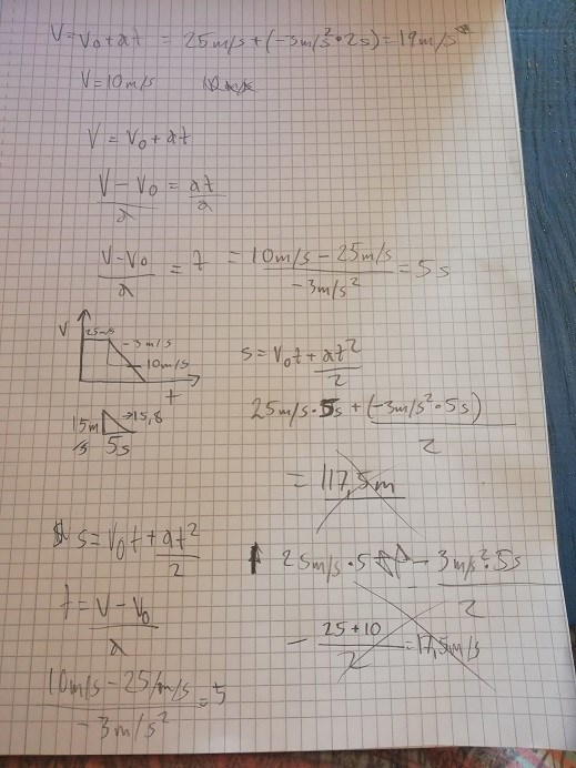 Jag satte in ^2 efter -3m/s för att det var accelerationen, så jag tänkte på ^2 som en del av den formeln, men det kanske snarare rör till det för mig när jag stoppar in enheterna i formlerna, för det verkar ju som att jag i nästa led rör ihop vad som ska beräknas och vad som bara står där och betecknar vad siffran står för..
