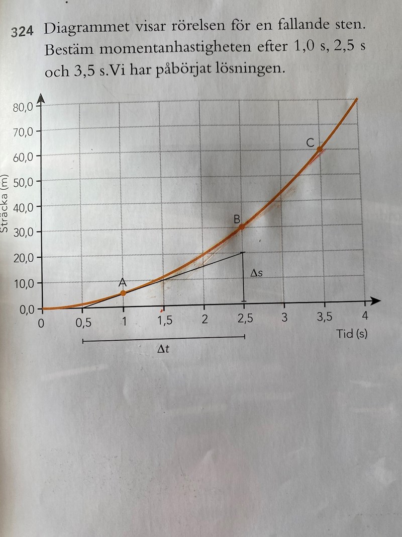 Momentanhastigheten vid en viss tidpunkt är lika med grafens lutning vid just den tidpunkten.