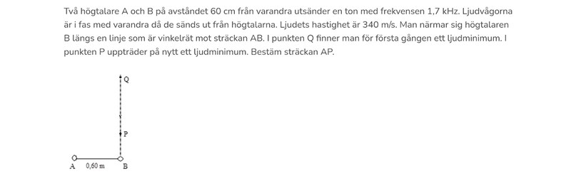 Ja, det står i uppgiften att det är _en_ ton. Det står också i uppgiften att man närmar sig högtalare B längs den streckade linjen (från långt håll). När man är på jättelångt håll så är vägskillnaden nästan noll. När du kommer till Q så har vägskillnaden vuxit till 0.5*lambda. När du kommer till P så har vägskillnaden vuxit till...