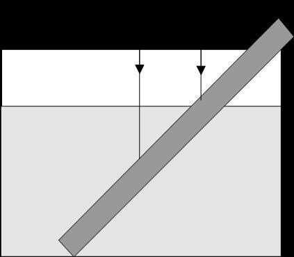 En tjock planparallell glasplatta är placerad i en glasbägare med vatten så att den lutar 45 mot vattenytan. En del av plattan befinner sig i luften - se figur. Två vertikala ljusstrålar träffar plattan enligt figuren. Den ena strålen träffar plattan under vattnet. Den andra strålen träffar plattan ovanför vattnet men lämnar glasplattan under vattnet. Vilken vinkel bildar de båda strålarna med varandra då de passerat genom glasplattan men inte lämnat vattnet?