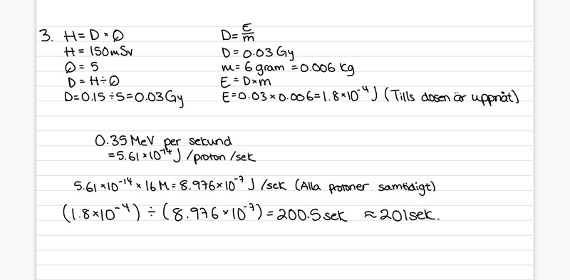 " Vid en olycka bestrålas en forskares ögon av 16 miljoner protoner varje sekund. Resten av kroppen är bättre skyddad. Protonernas energi är 0,35 MeV. Om vi antar att linserna väger 6,0 gram tillsammans, hur lång tid tar det innan strålgränsen passeras? Vi vet att dosgränsen för ögats lins är 150 mSv och kvalitetsfaktorn för protonstrålning är 5."