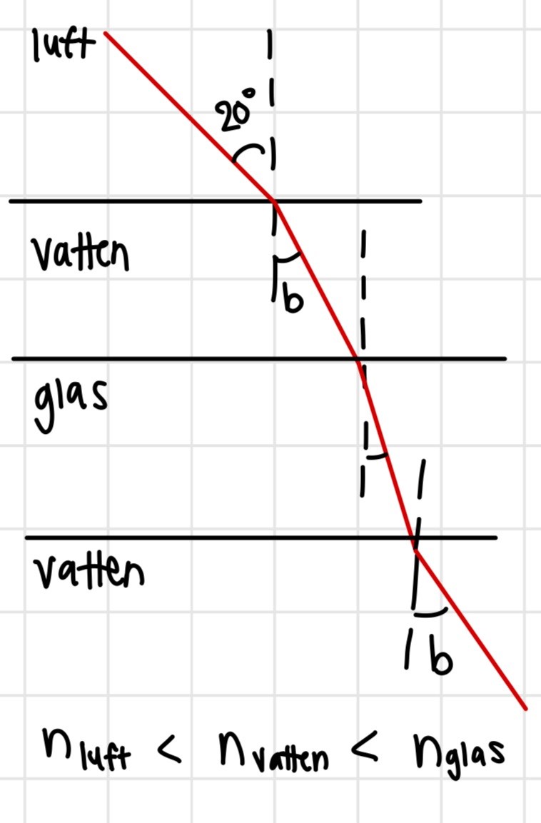 Du kan antingen räkna med tal på det eller så kan du resonera som att vinkeländringen från luft till vatten kan beskrivas med hjälp av en förändringsfaktor och att vinkeländringen från vatten till glas kan beskrivas med hjälp av en annan förändringsfaktor.