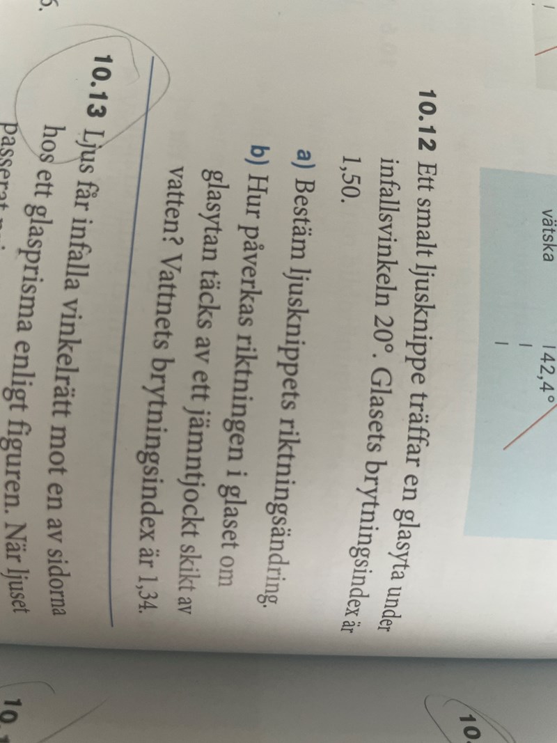 Ett smalt glasknippe träffarem glasyta. Hur påverkas riktningen i glaset om glasytan täcks av ett jämntjockt skikt av vatten? Glasets brytningsindex är 1,50 och vattnets brytningsindex är 1,34.