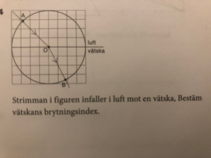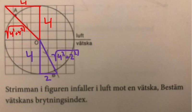 Dr. G skrev:Kan du från figuren bestämma (sinus för) infallsvinkeln och (sinus för) brytningsvinkeln?