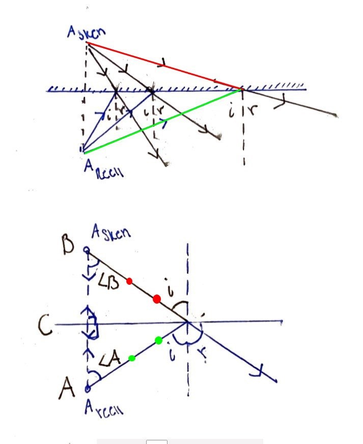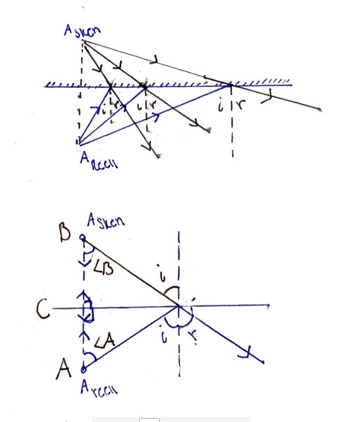 De blåa strecken, från AReell är ljuset, och Asken är dem imaginära strålarna för att hitta reflextionen.