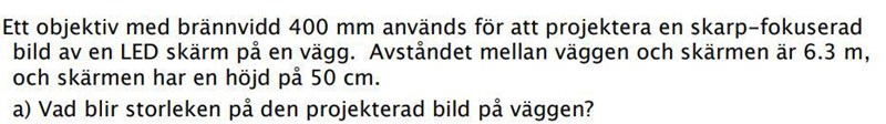 Vilken information kan jag möjligen härledda från a + b, brännviden och höjden på skärmen. Det känns som jag måste veta a eller b, eller höjden på den projekterade bilden för att använda vidare ekvationer.