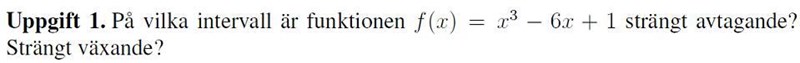 Derivatans nollställen är och , däremellan avtar den, i övrigt växer den. Jag anser att den är strängt avtagande i det öppna intervallet eftersom ändpunkternas lutning är 0. I facit anger de dock att den är strängt avtagande i det slutna begränsade intervallet . (Motsvarande gäller för de övriga intervall där funktionen växer - där har de också tagit med ändpunkterna.) Hur kan detta stämma? För strängt avtagande gäller ju , inte - då är den ju bara avtagande.