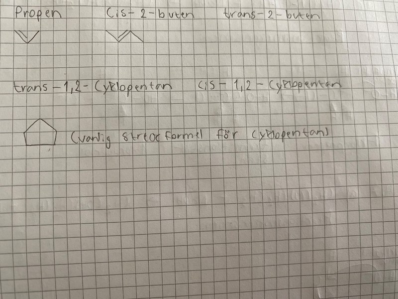 Jag undrar hur streckformeln ser ut för propen, cis-2-buten, trans-2-buten, trans-1,2-cyklopentan och cis-1,2-cyklopentan? Jag har googlat upp och försök hitta streckformlarna men hittar inget! Tror att jag har skrivit rätt på propen och cis-2-buten, infogar bild.
