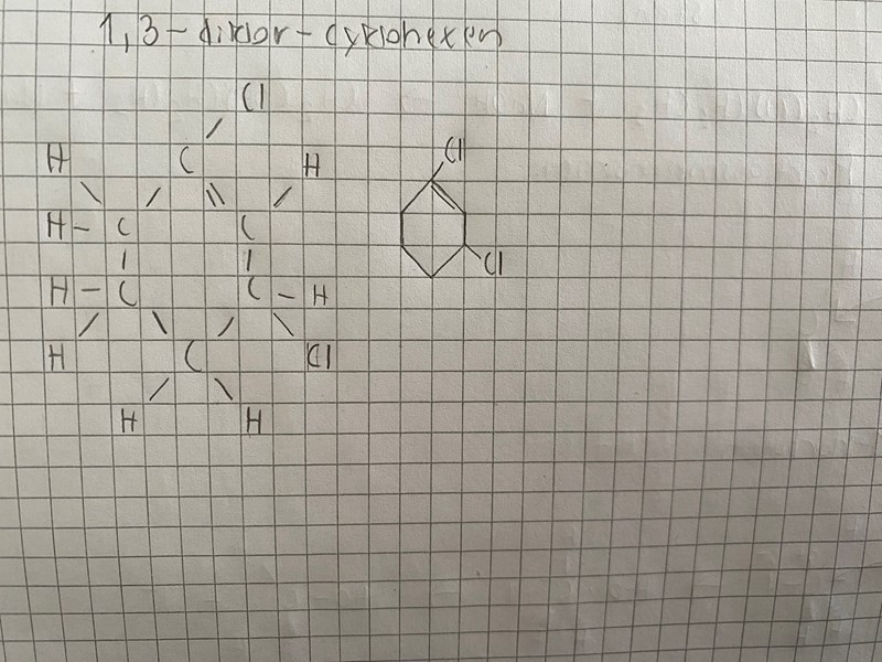 Sen undrar jag en till sak, är strukturformeln och streckformeln som jag ritat upp för 1,3-diklor-cyklohexen rätt?