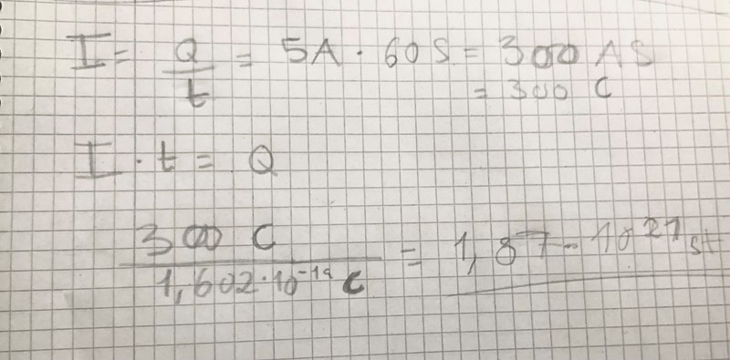 Genom en ledare går ström på 5,0A. Hur många elektroner passerar ett visst ställe av ledaren under en minut?
