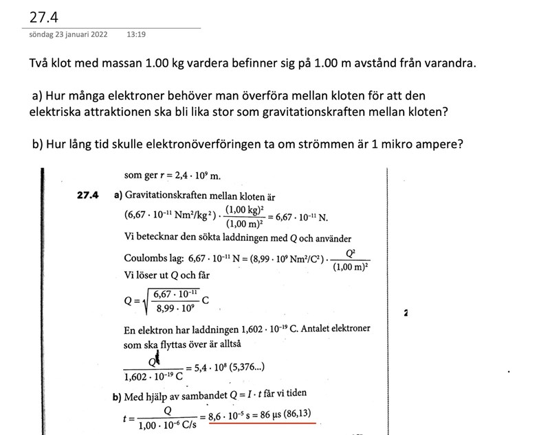 Bubo skrev:Antalet elektroner är 5.4*108. De har laddningen 1.602*10-19 C = 1.602*10-19 As.
