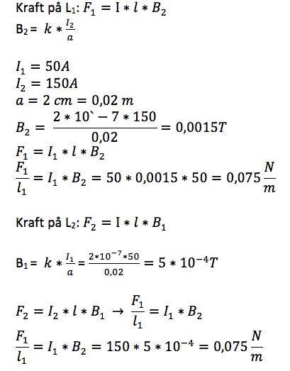 Avståndet mellan två långa parallella ledare är 2,0 cm. Genom ledaren A går strömmen 50 A och genom ledare B går strömmen 150 A. Hur stor kraft verkar på grund av detta på varje meter av ledaren? Svara med två värdesiffror.