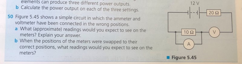 Börja med att göra b-uppgiften. Då kan du försumma strömmen genom voltmetern och spänningen över amperemetern - låtsas att de inte är där, och beräkna spänningen över 10 ohms-motståndet och strömmen genom kretsen.