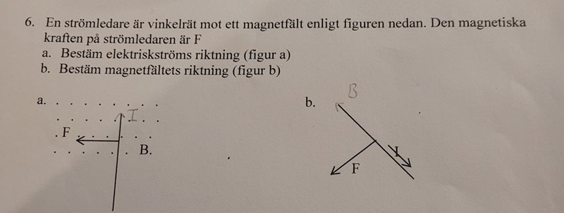Den andra är dock fel, dessa tre verkar ju i 3 olika dimensioner. I ditt svar är endast 2 dimensioner med, tänk högerhanden igen, strömmen i tummens riktning och F ut från handflatan. Hur går då magnetfältet som är vinkelrät med båda?
