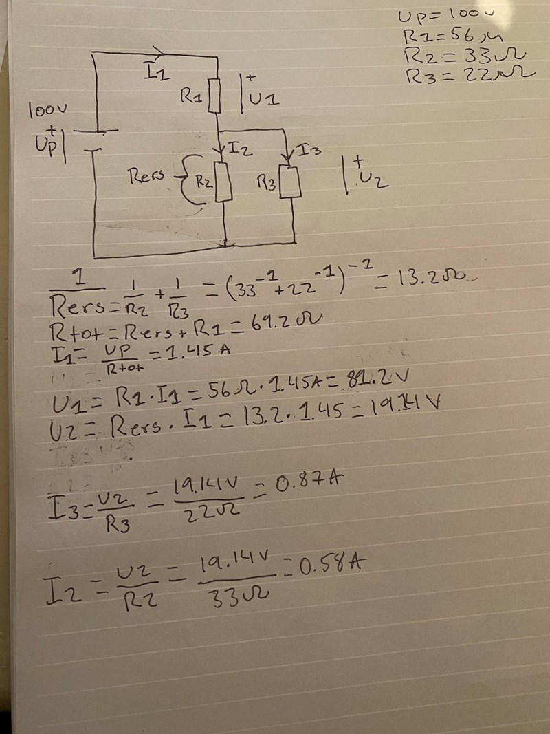 Har gjort beräkningar av ström, spänning och resistans i en krets. Vill någon bara säga om det ser bra ut och om jag använt rätt formler för att beräkna dem olika spänningarna, ström och resistans? Är lite osäker