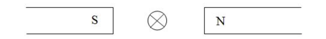 Fråga:En ledare befinner sig mitt emellan polerna på en permanentmagnet. Strömmen i ledaren går i riktning in mot papprets plan (bort från läsaren). Hur är den kraft som verkar på ledaren riktad?