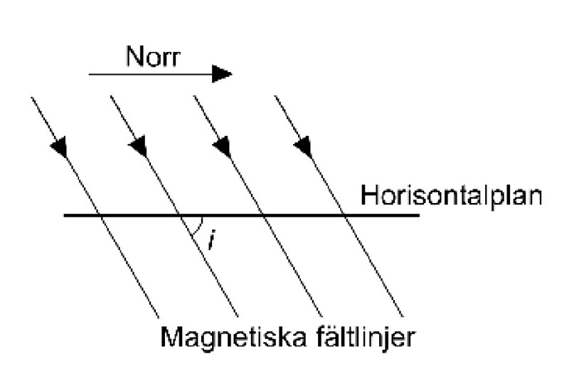 Men för Sverige är magnetfältets inklination ner i marken:Och det hade blivit samma svar om man hade ritat för södra halvklotet.