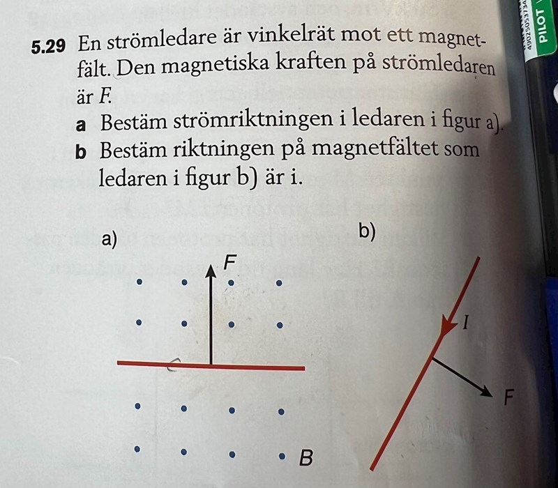 Får att strömmen går till höger i a), men det ska vara vänster enligt facit. Tänker att långfingret visar kraften pekfingret flödestäthet b som är riktad mot mig och då går tummen till höger.( Det ser ut som om man pekar långfingret mot pappret), varför blir det fel?