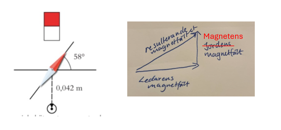 Där kompassnålen är har vi alltså två samverkande magnetfält. Ett vertikalt från magneten med fältstyrkan 12uT och ett horisontellt från strömmen i ledaren. De två gör att kompassnålen ställer sig i vinkeln 58 grader.