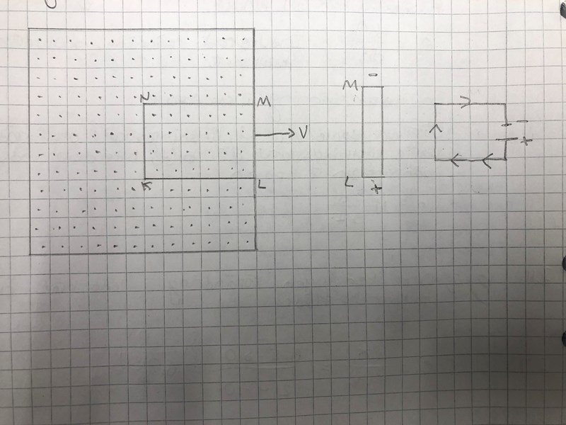 Titta på NK. (ML försvinner ju ut ur fältet). Hastigheten är åt höger, B-fältet ut ur skärmen, så magnetisk kraft på positiva laddningar är nedåt i bild och driver en ström moturs. Med ML ute ur fältet så finns ingen motsvarande ström medurs, så nettoströmmen blir moturs.