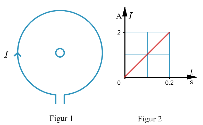 Figuren visar två koncentriska cirkulära strömslingor vardera med ett enda varv med radierna 10 cm respektive 1,0 cm. Strömmen I i den yttre slingan har den riktning som anges i figur 1. I varierar med tiden enligt figur 2. Flödestätheten B kan antas vara konstant i ett område nära slingans centrum.