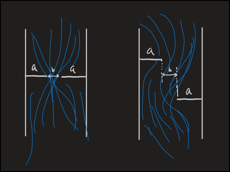 Om vi tar B och lägger till (oändligt många) fler a-långa vägger med jämna mellanrum (varannan sida), kommer flödet bli samma som i A?
