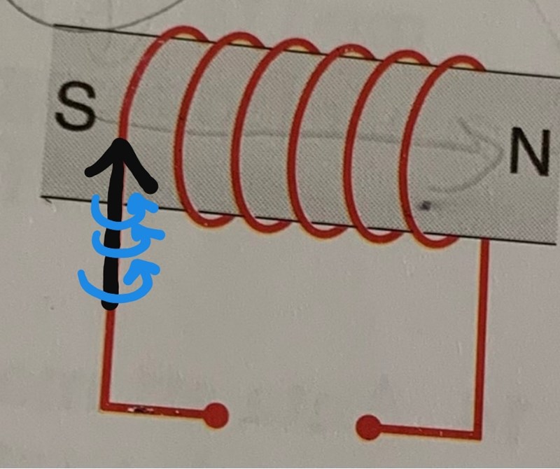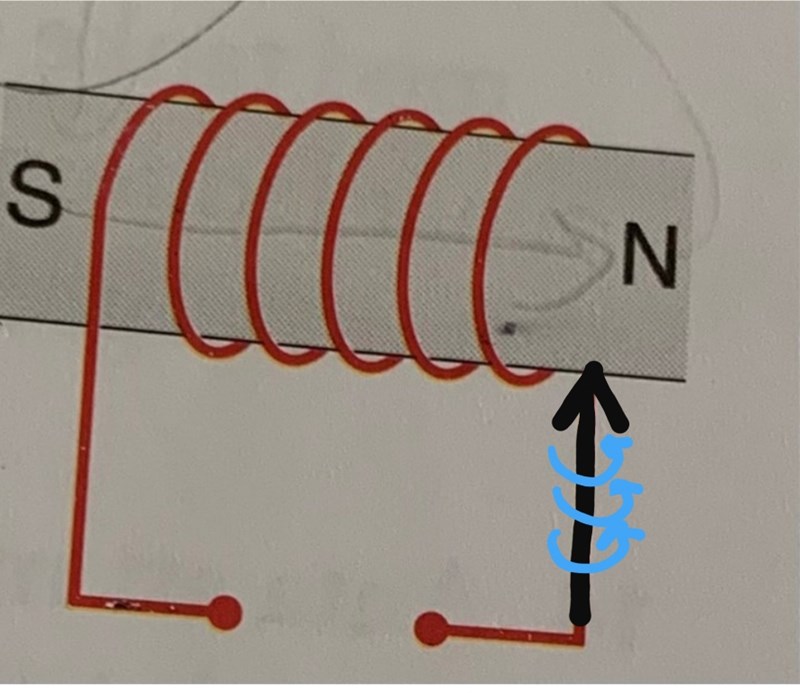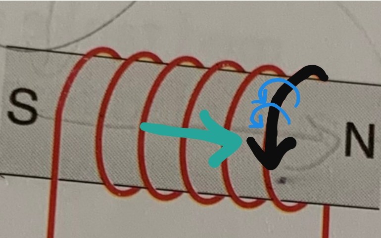 Jag har tyvärr väldigt svårt att förstå detta , hur ska pilarna stämma överens med magnetfältet? Magnetfältet i spolen går från S till N om jag har rätt? Vilket magnetfält i bilden? :((