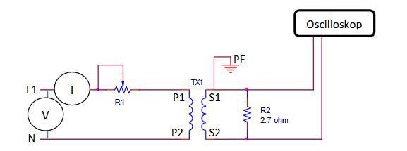 Men eftersom du inte fick tillfälle att göra labben, så måste du "låtsas" att du mätte ett spänningsvärde med oscilloskåpet, eller hur? Om du mäter ett spänningsvärde på oscilloskåpet, låt säga , så kan du sedan räkna ut både strömmen genom lasten och spänningen över lasten. Förutsatt att , transformatorns lindningsomsättning, och är redan kända värden.