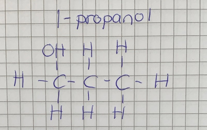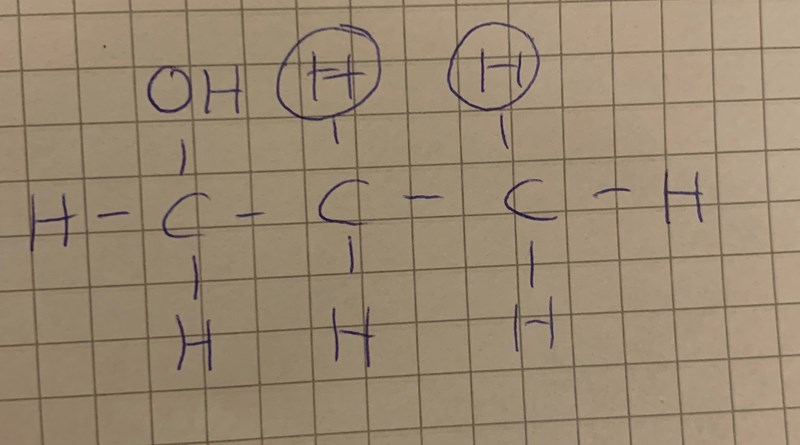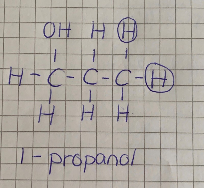 Rita upp 1-propanol. Ringa in de båda väteatomer man kan ta bort (ingen av dem skall sitta på samma kolatom som OH-gruppen. Vilken molekyl bildas?