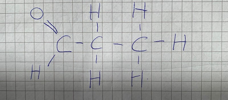 Okej, då tar jag bort dessa två vätena så bildas det Propanal. Men eftersom det är en aldehyd blir det inte dubbelbindning till syret? Varför behöver jag inte skriva ut vilken kolatom som aldehydgruppen är på?